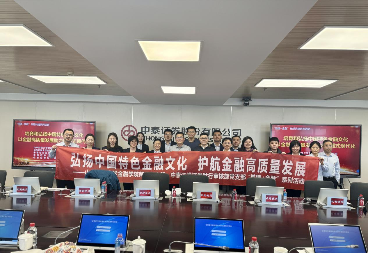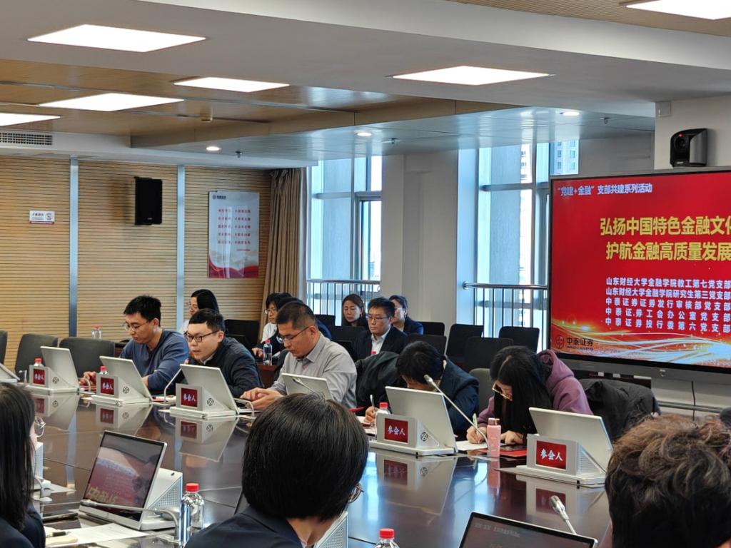 为深入学习宣传贯彻党的二十大精神,进一步坚定理想信念,激发党员队伍的凝聚力,11月28日,由金融学院副院长王营带队,金融学院教工第七党支部、研究生第三党支部与中泰证券证券发行审核部党支部、中泰证券工会办公室党支部、中泰证券投行委第六党支部联合开展“弘扬中国特色金融文化,护航金融高质量发展”支部共建活动。活动由中泰证券证券发行审核部党支部书记战肖华主持。