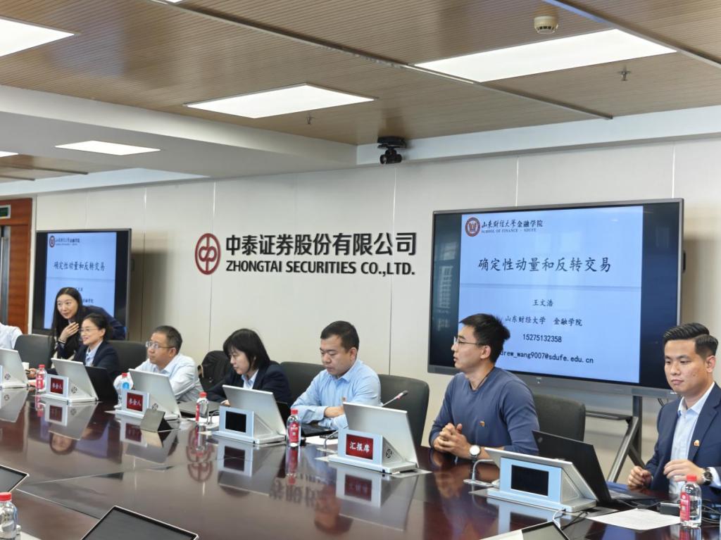 中泰证券投行委第六党支部王飞介绍了投行业务条线,金融学院教工第七党支部书记尹智超、海归教师代表王文浩副教授进行了业务交流专题汇报。尹智超副教授围绕“机器学习在财务舞弊识别中的应用”进行了专题分享,王文浩副教授就“中国特色金融研究——确定性动量和反转交易”进行了专题介绍。中泰证券证券发行审核部副总经理齐修超分别从“发现好的公司”与“识别坏的公司”两个角度进行了点评。