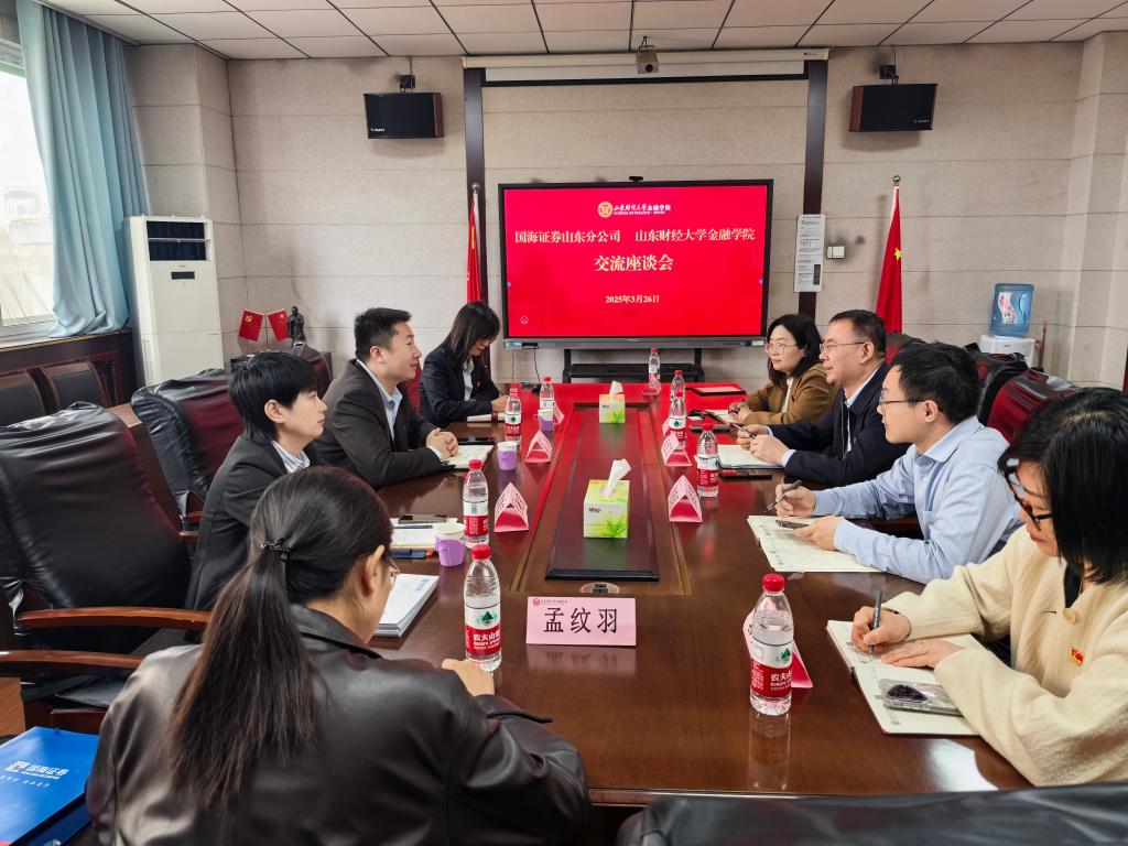为进一步加强校企合作,探索人才培养新模式,3月26日,金融学院与国海证券山东分公司在舜耕校区开展座谈交流。国海证券山东分公司总经理马庆,学院党委书记吴红文,副院长王倩、肖祖沔等人参加座谈。