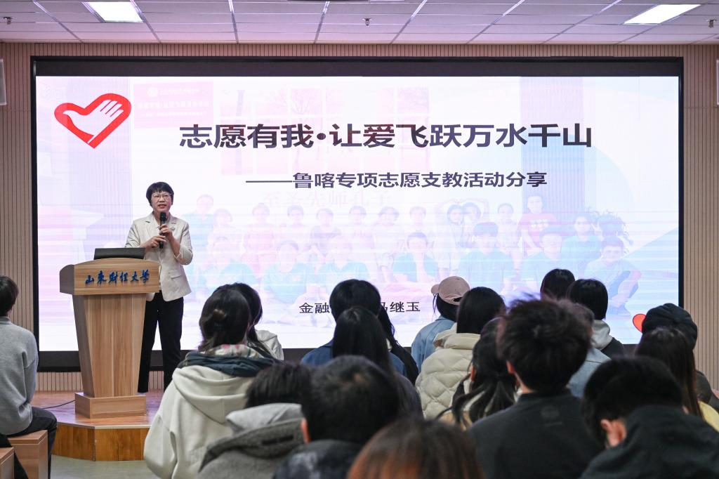 马继玉老师讲述了鲁喀专项支教团面对支教的重重挑战——偏远山区的安全隐患、频发的极端天气、志愿者的水土不服等一系列问题,依然坚持用爱与责任破局,无论是志愿者怀抱数小时孩子纹丝不动,还是他们发烧仍坚持授课的身影,都以实际行动践行了“奉献、友爱、互助、进步”的志愿服务精神,用自己的故事诠释志愿服务的深刻内涵与无限价值。