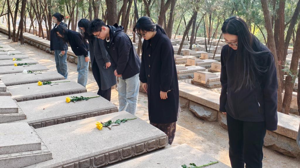 宣誓结束后,同学们缓步至烈士墓前,肃立鞠躬,向为民族独立和人民解放献出生命的英烈致以深切哀思。最后,全体人员面向革命主题浮雕鞠躬默哀,以无声的敬意缅怀先烈丰功伟绩。