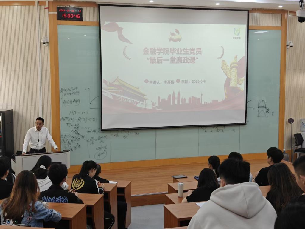 为深入推进校园廉洁文化建设,助力毕业生党员顺利实现从校园到社会的角色转变,引导青年党员扣好职业生涯“第一粒扣子”,5月6日下午,金融学院为毕业生党员上了“最后一堂廉政课”。本次党课由学院党委副书记李开传主讲,学院全体毕业生党员参加。