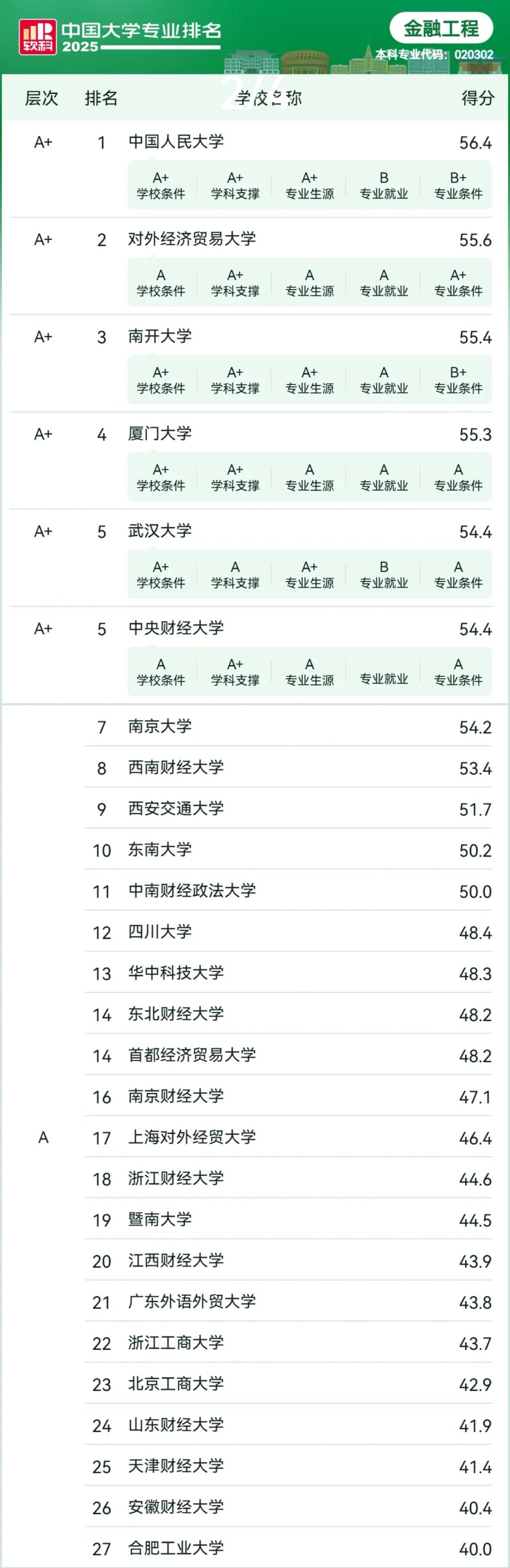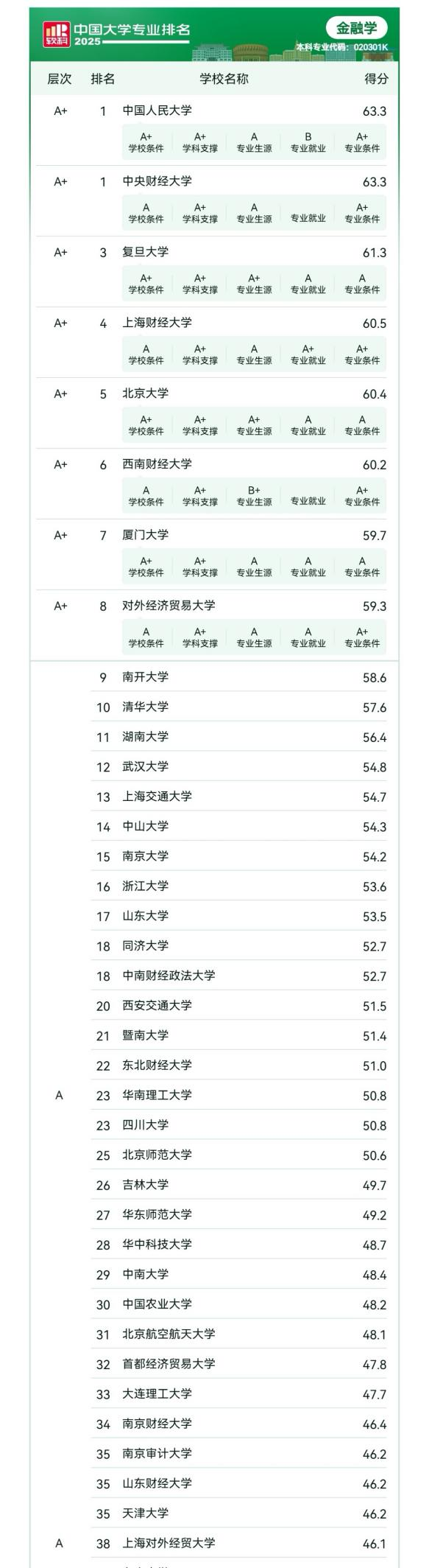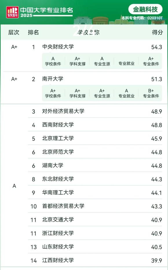 在“2025软科中国大学专业排名”里,山东财经大学金融学院交出了一份亮眼的成绩单。学院的金融学、金融工程、投资学、金融科技四个专业都成功跻身A层次,金融学专业位列第35名,金融工程专业位列第24名,投资学专业位列第14名,金融科技专业位列第13名。
