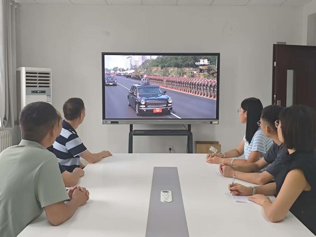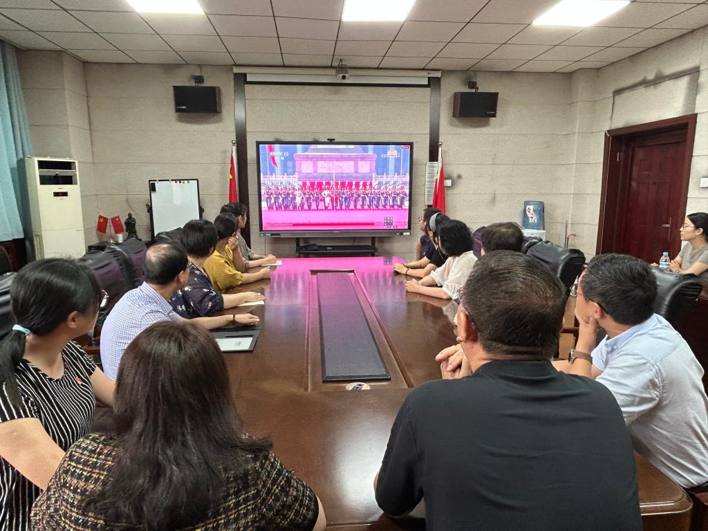 伴随着激昂的《分列式进行曲》,空中护旗梯队、徒步方队、战旗方队、装备方队、空中梯队依次通过天安门广场,接受祖国和人民的检阅。训练有素的方阵、精密先进的装备,无不展示着我国强大的综合实力。在庄严而隆重的阅兵式直播画面面前,师生们神情专注,现场气氛肃穆而热烈,充分展现了我院师生深厚的家国情怀与昂扬的精神风貌。