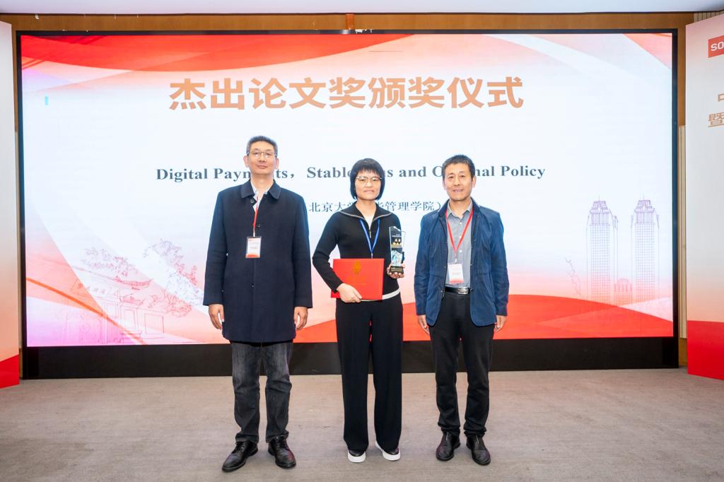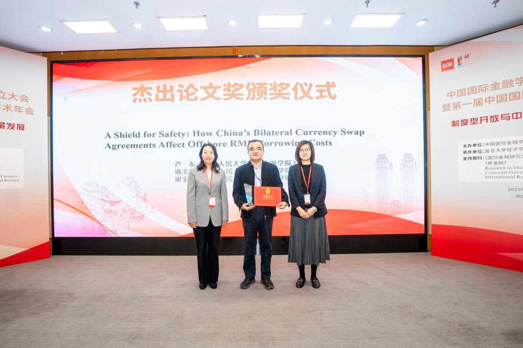 中国人民大学的芦东、俄美合、谢宏杰合作的论文“A Shield for Safety: How China’s Bilateral Currency Swap Agreements Affect Offshore RMB Borrowing Costs”获得本届年会杰出论文奖。昆明学院校长丁文丽、《国际金融研究》副主编赵雪共同为获奖者颁奖。