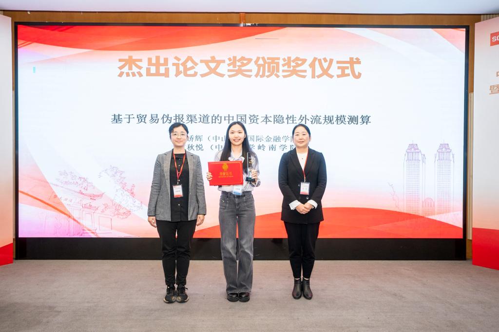 中山大学杨娇辉和江秋悦合作的论文《基于贸易伪报渠道的中国资本隐性外流规模测算》获得本届年会杰出论文奖。山东大学经济学院副院长张群姿、重庆工商大学金融学院院长王兰共同为获奖者颁奖。