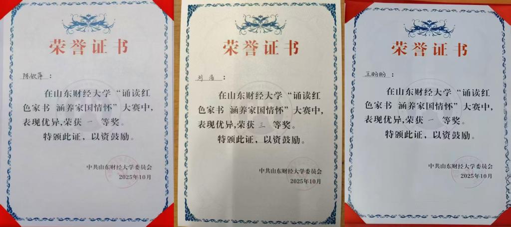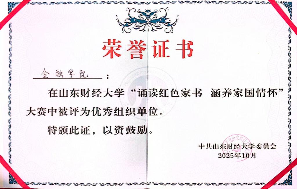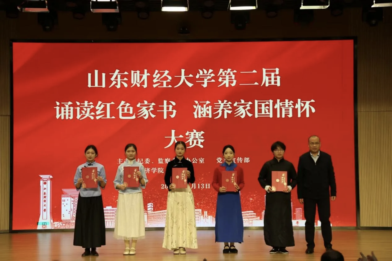 11月13日,山东财经大学第二届“诵读红色家书 涵养家国情怀”大赛在章丘校区大学生文体活动中心圆满落幕。金融学院王盼盼、陈钦萍、刘浩三位同学历经三轮比拼,凭借深厚红色素养与昂扬风貌,分别斩获一等奖、三等奖。金融学院荣获最佳组织单位称号。