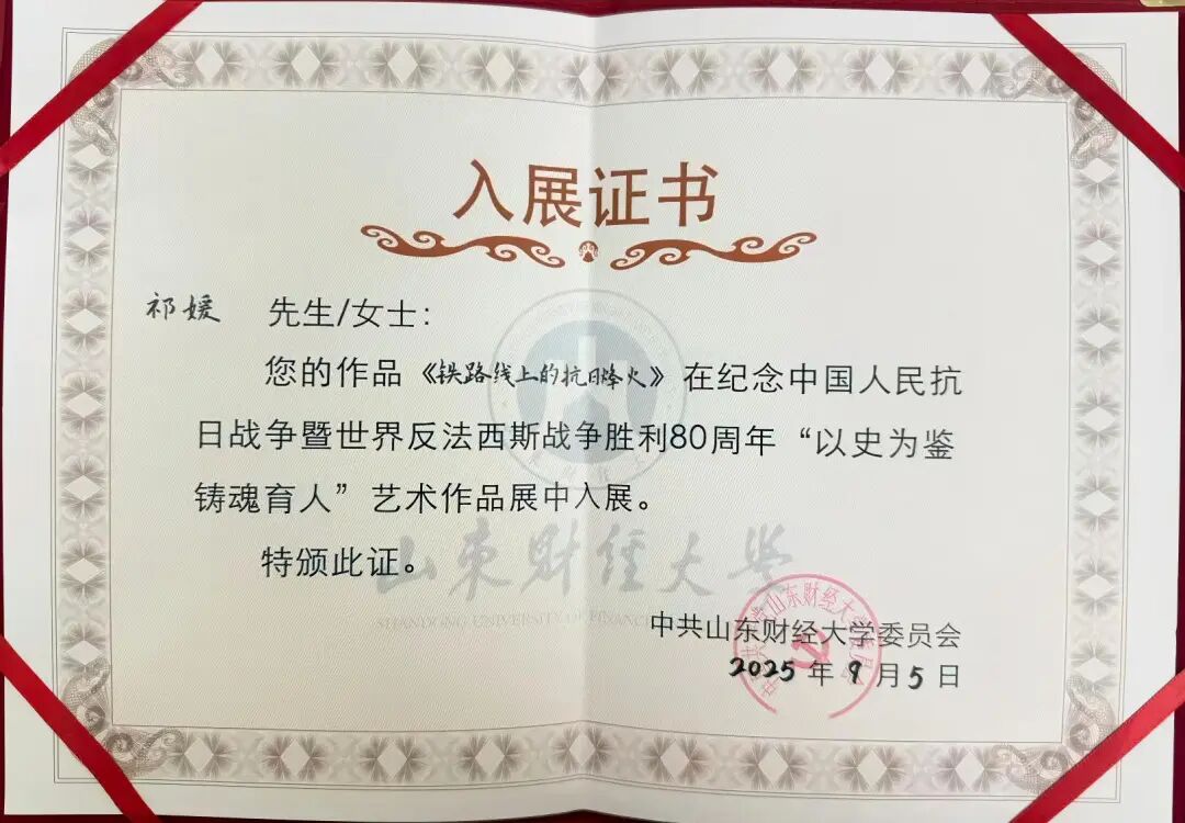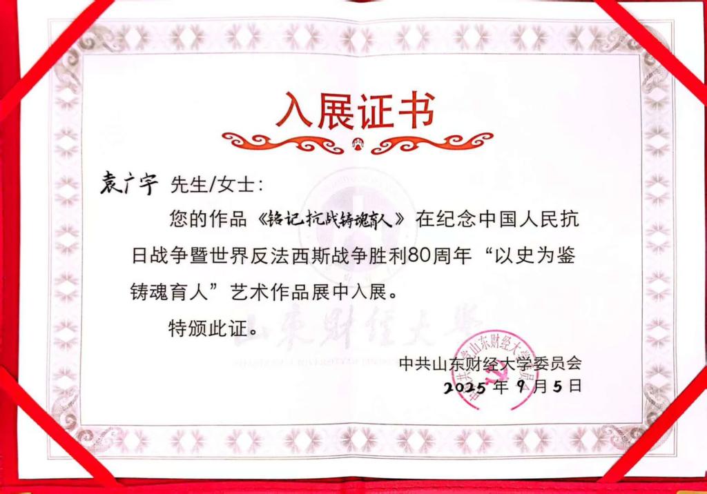 近日,在我校举办的纪念中国人民抗日战争暨世界反法西斯战争胜利80周年“以史为鉴 铸魂育人”艺术作品展中,金融学院两名学生的作品成功入展,展现了新时代青年铭记历史、传承精神的责任担当。