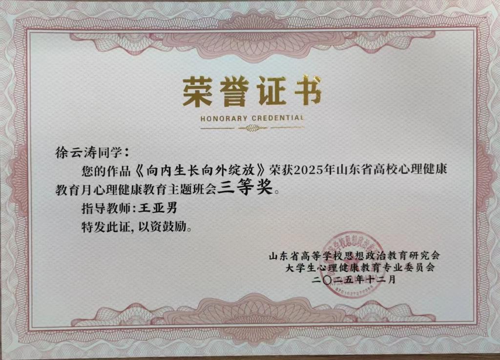 12月3日至5日,山东省大学生心理健康教育专业委员会2025年年会暨第二届高校心理教师教学技能展示与观摩活动在山东理工大学举办。我院教师徐洁荣获心理教师教学技能展示与观摩活动决赛(普通高校组)一等奖。我院王亚男老师指导的由2024级金融专硕2班徐云涛主讲作品《向内生长向外绽放》荣获2025年山东省高校心理健康教育月心理健康教育主题班会三等奖。