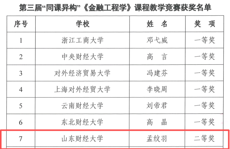 2025年12月6—7日,第三届“同课异构”《金融工程学》教学竞赛在浙江工商大学举行。赛事由中国高校财经慕课联盟主办、中国高等教育学会高等财经教育分会指导,旨在贯彻全国教育工作会议精神,纵深推进财经类高校课程教学改革。金融学院孟纹羽副教授与来自全国的28位教师同台竞技,在“教学设计+现场授课”双环节激烈角逐中斩获二等奖第一名。
