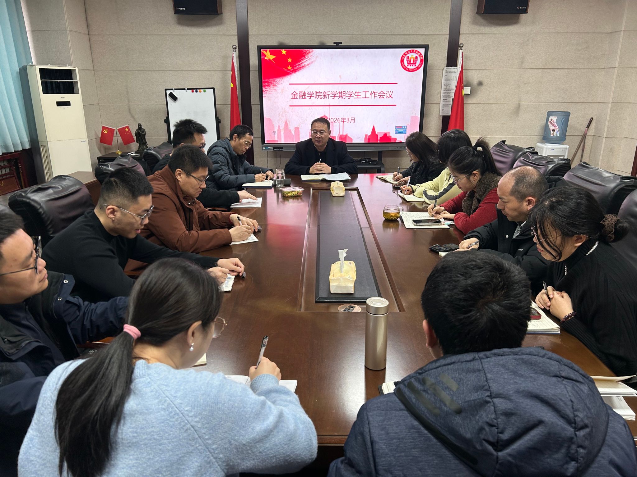 为贯彻落实学校2026年度工作动员部署会会议精神,统筹推进新学期学生工作高质量开展,3月8日,金融学院在舜耕校区金融楼314会议室召开新学期学生工作会议。会议由学院党委书记吴红文主持,学院党委副书记朱翠珍、李开传以及全体辅导员参加会议。