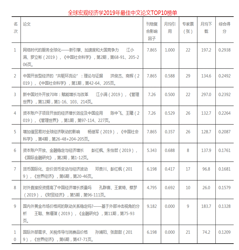 近日,《世界经济年鉴》期刊公布了世界经济学2019年最佳论文TOP10榜单。金融学院彭红枫教授与清华大学五道口金融学院朱怡哲博士合作发表于《国际金融研究》2019年第2期的文章《资本账户开放、金融稳定与经济增长》、与中山大学国际金融学院邓贵川博士合作发表于《世界经济》2019年第6期的文章《货币国际化、定价货币变动与经济波动》入选“全球宏观经济学2019年最佳中文论文TOP10榜单”。