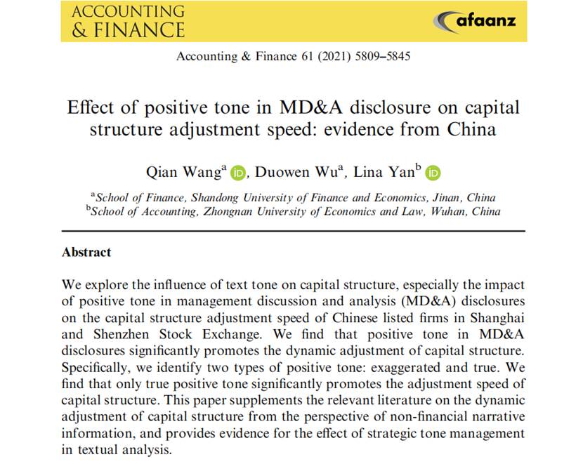 金融学院王倩副教授作为第一作者与山东财经大学博士研究生吴多文、中南财经政法大学严丽娜副教授合作的论文“Effect of positive tone in MD&A disclosure on capital structure adjustment speed: evidence from China”在期刊《Accounting and Finance》发表(2021年4月3日第61卷第4期)。该期刊系金融与会计类SSCI二区期刊,2020年影响因子为2.942,属我校A1类期刊。