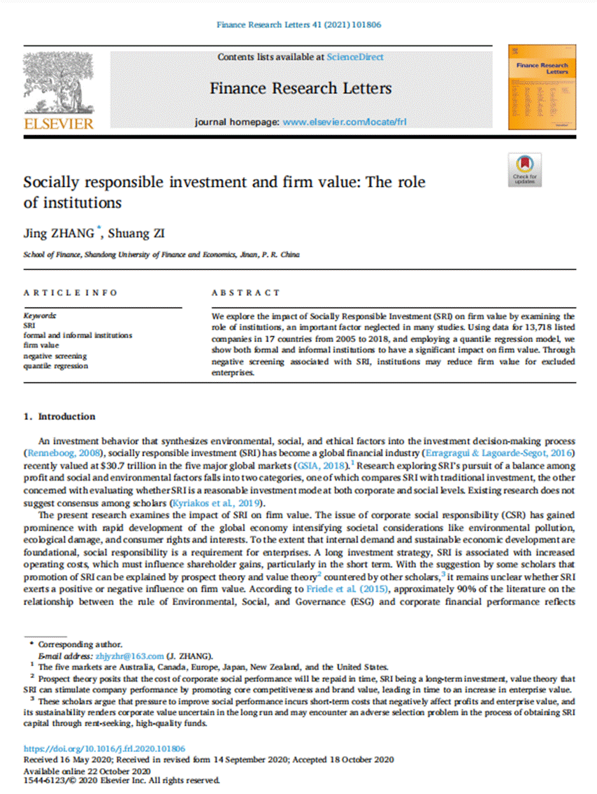 金融学院张晶教授作为第一作者与山东财经大学金融学院博士研究生訾爽合作的论文“Socially Responsible Investment and Firm Value: The Role of Institutions”在期刊《Finance Research Letters》发表(2021年6月第41卷)。该期刊系商业金融类SSCI一区期刊,2020年影响因子为5.596,属我校A1类期刊。