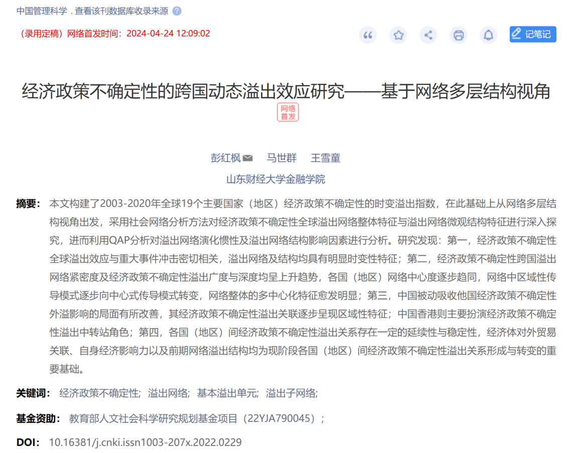 山东财经大学金融学院彭红枫教授(第一作者、通讯作者)指导博士研究生马世群、科研助理王雪童撰写的论文《经济政策不确定性的跨国动态溢出效应研究——基于网络多层结构视角》于《中国管理科学》网络首发。该期刊属于我校A2类期刊。