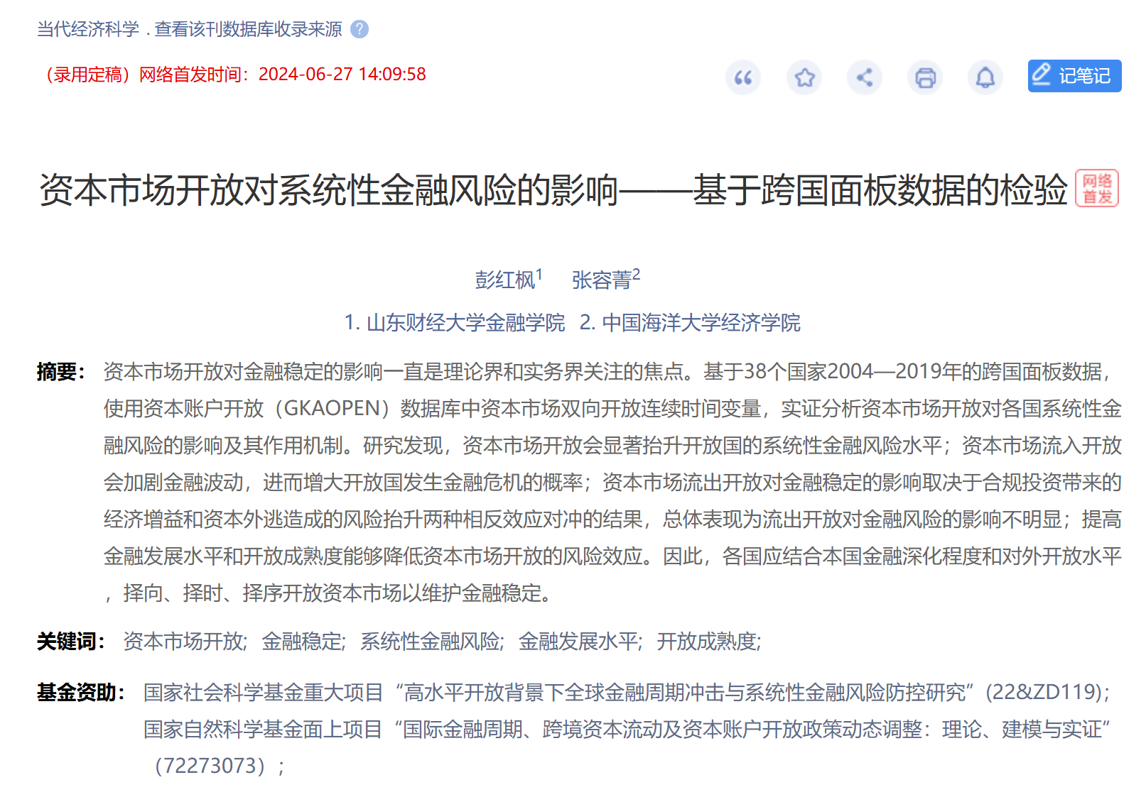 山东财经大学金融学院彭红枫教授(第一作者、通讯作者)与中国海洋大学经济学院张容菁博士合作撰写的论文《资本市场开放对系统性金融风险的影响——基于跨国面板数据的检验》在《当代经济科学》网络首发。该期刊系我校A2类期刊。