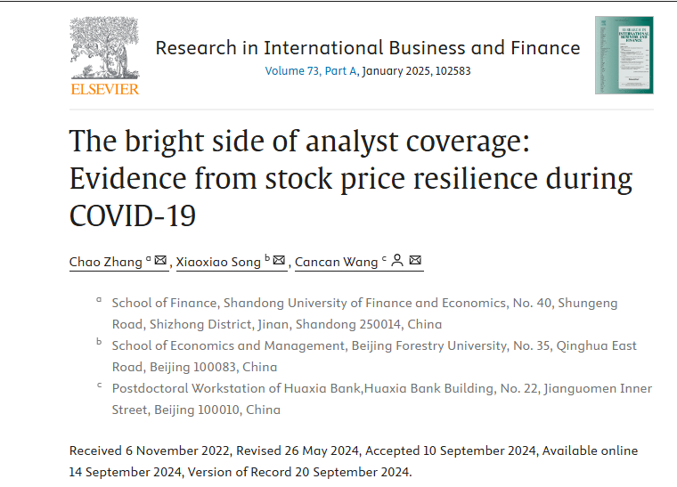 金融学院青年教师张超作为第一作者与北京林业大学宋肖肖博士、华夏银行博士后流动站王灿灿博士(通讯作者)合作的论文《The bright side of analyst coverage: Evidence from stock price resilience during COVID-19》在《Research in International Business and Finance》2025年第73卷(Volume73),PartA在线发表。该期刊为SSCI一区期刊,期刊最新影响因子为6.3,属我校A1类期刊。https://doi.org/10.1016/j.ribaf.2024.102583