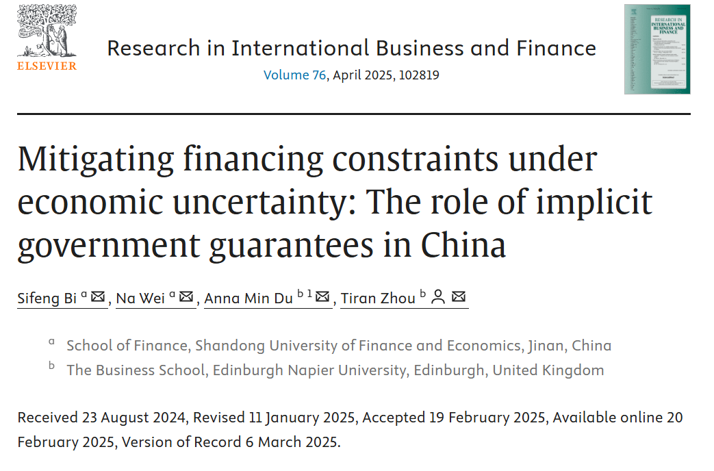 金融学院毕泗锋教授作为第一作者与硕士生魏娜、英国Edinburgh Napier University的Anna Min Du教授以及Tiran Zhou助理教授合作的论文“Mitigating financing constraints under economic uncertainty:The role of implicit government guarantees in China”在期刊《Research in International Business and Finance》2025年第76卷(Volume 76, April 2025, 102819)发表。该期刊为SSCI一区期刊,期刊最新影响因子为6.3,属我校A1类期刊。