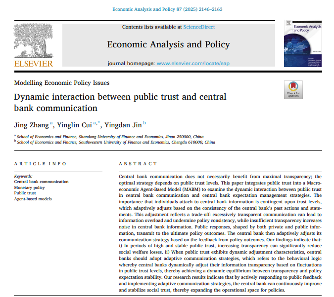 金融学院张晶教授作为第一作者与博士研究生崔瑛麟(通讯作者)、硕士毕业生靳英丹(现为西南财大博士研究生)合作撰写的论文《Dynamic interaction between public trust and central bank communication》,于2025年9月在期刊《Economic Analysis and Policy》在线发表。该期刊最新影响因子为8.7,属我校A1类期刊。