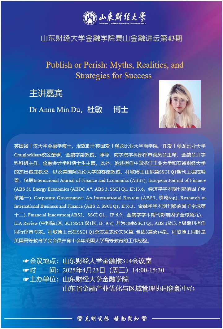 Dr Anna Min Du,杜敏博士,英国诺丁汉大学金融学博士,现就职于英国爱丁堡龙比亚大学商学院,任爱丁堡龙比亚大学 Craiglockhart校区董事,金融学副教授,博导,商学院本科部评审委员会主席,金融会计学科科研主任,金融会计学科博士生主管。此外,她还担任中国浙江工业大学和安徽财经大学的杰出客座教授,以及美国阿克伦大学的客座教授。杜敏博士任多篇SSCI Q1期刊主编或编委,包括International Journal of Finance and Economics (ABS3), European Journal of Finance (ABS 3), Energy Economics (ABDC A*, ABS 3, SSCI Q1, IF:13.6,经济学学术期刊影响因子全球第一), Corporate Governance: An International Review (ABS3, 领域top), Research in International Business and Finance (ABS 2, SSCI Q1, IF:6.3,金融学学术期刊影响因子全球第十二), Financial Innovation(ABS2,SSCI Q1,IF:6.9,金融学学术期刊影响因子全球第九),EIA Review (中科院1区, SCI SSCI 双1区, IF: 9.8), 并为50余SSCI Q1, ABS 3及以上级期刊担任同行评审专家。杜敏博士已在SSCI Q1杂志发表论文80篇, 包括3篇abs4星。杜敏博士同时是英国高等教育学会会员并有十余年英国大学高等教育的工作经验。