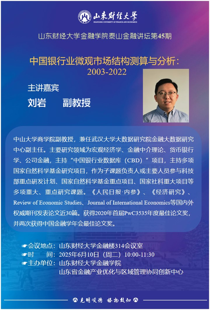 刘岩,中山大学商学院副教授,兼任武汉大学大数据研究院金融大数据研究中心副主任。主要研究领域为宏观经济学、金融中介理论、货币银行学、公司金融,主持“中国银行业数据库(CBD)”项目,主持多项国家自然科学基金研究项目,作为子课题负责人或主要人员参与科技部重点研发计划、国家自然科学基金重点项目、国家社科重大项目等多项重大、重点研究课题。《人民日报·内参》、《经济研究》、Review of Economic Studies、Journal of International Economics等国内外权威期刊发表论文近30篇。获得2020年首届PwC3535年度最佳论文奖,并两次获得中国金融学年会最佳论文奖。